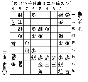 ▲7六飛△7四歩▲9三歩△7五歩▲9二歩成(下図)