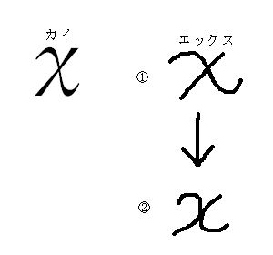 先生も、カイとエックスは間違いやすいので、エックスは②の方法で書くようにと注意された。